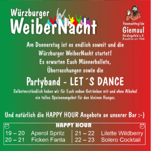 Countdown zur Würzburger WeiberNacht: Übermorgen ist es soweit! Der Donnerstag rückt immer näher und die Vorbereitungen der Fasenachtsgilde Giemaul Heidingsfeld e.V. laufen auf Hochtouren. Am